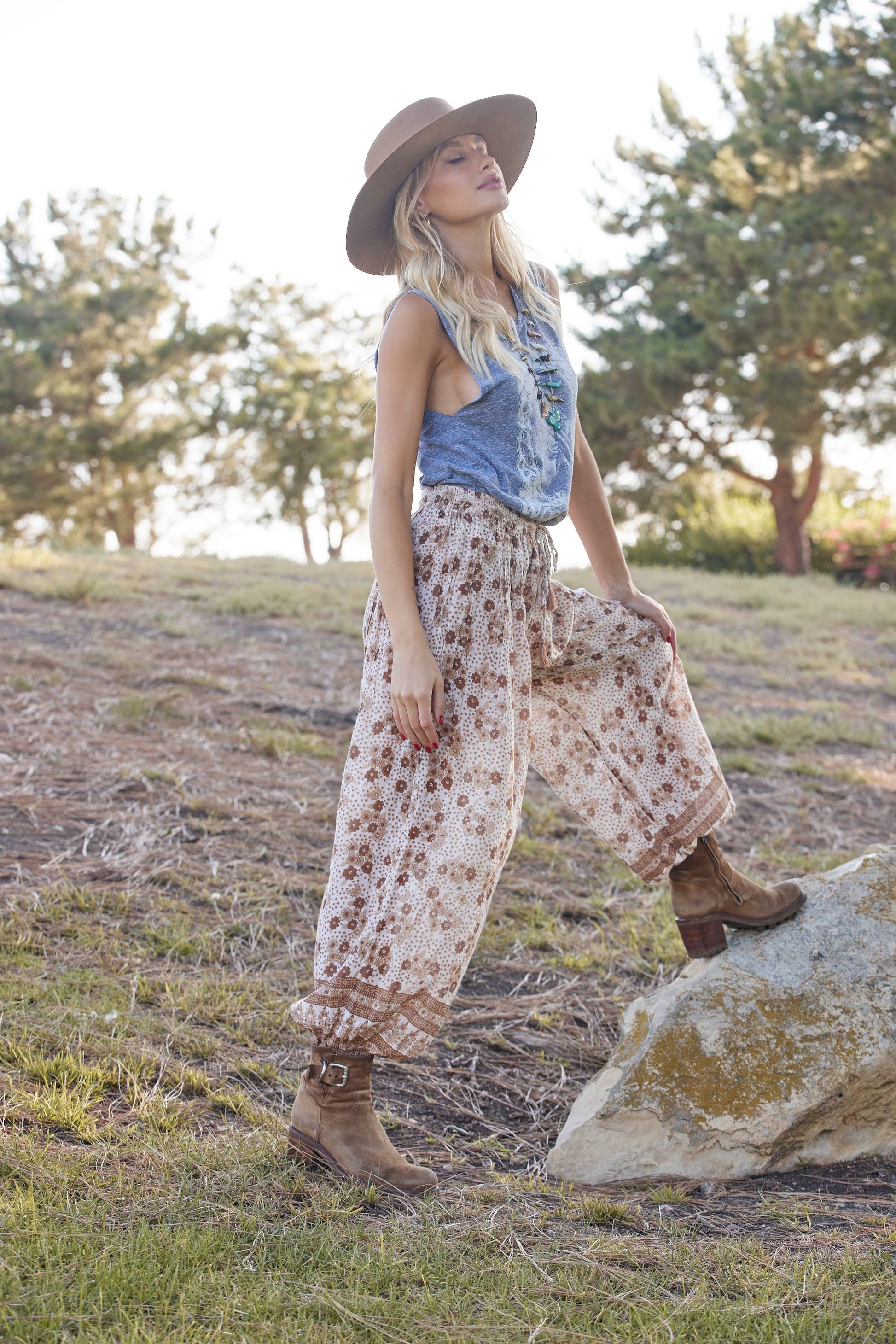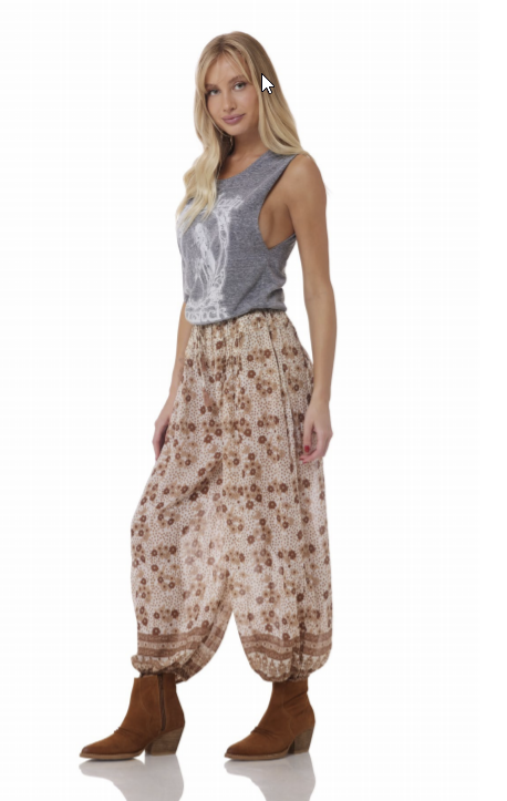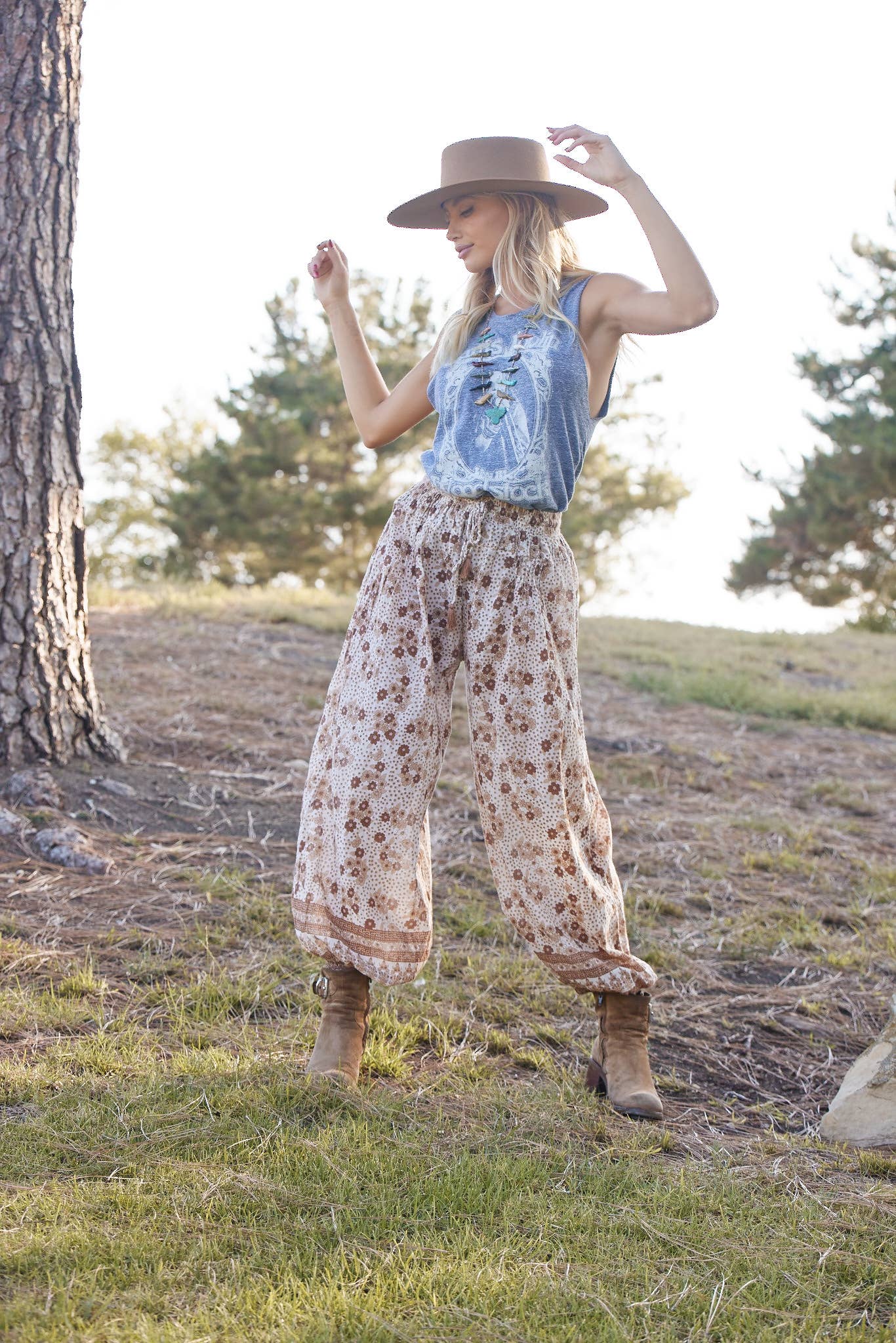 The Anna bohemian harem pants in camel are an absolute classic this summer. Make a statement in these so-fun printed pants featured in a high-rise design with a drawstring waist and cinched ankles. Anna Printed Harem Pants