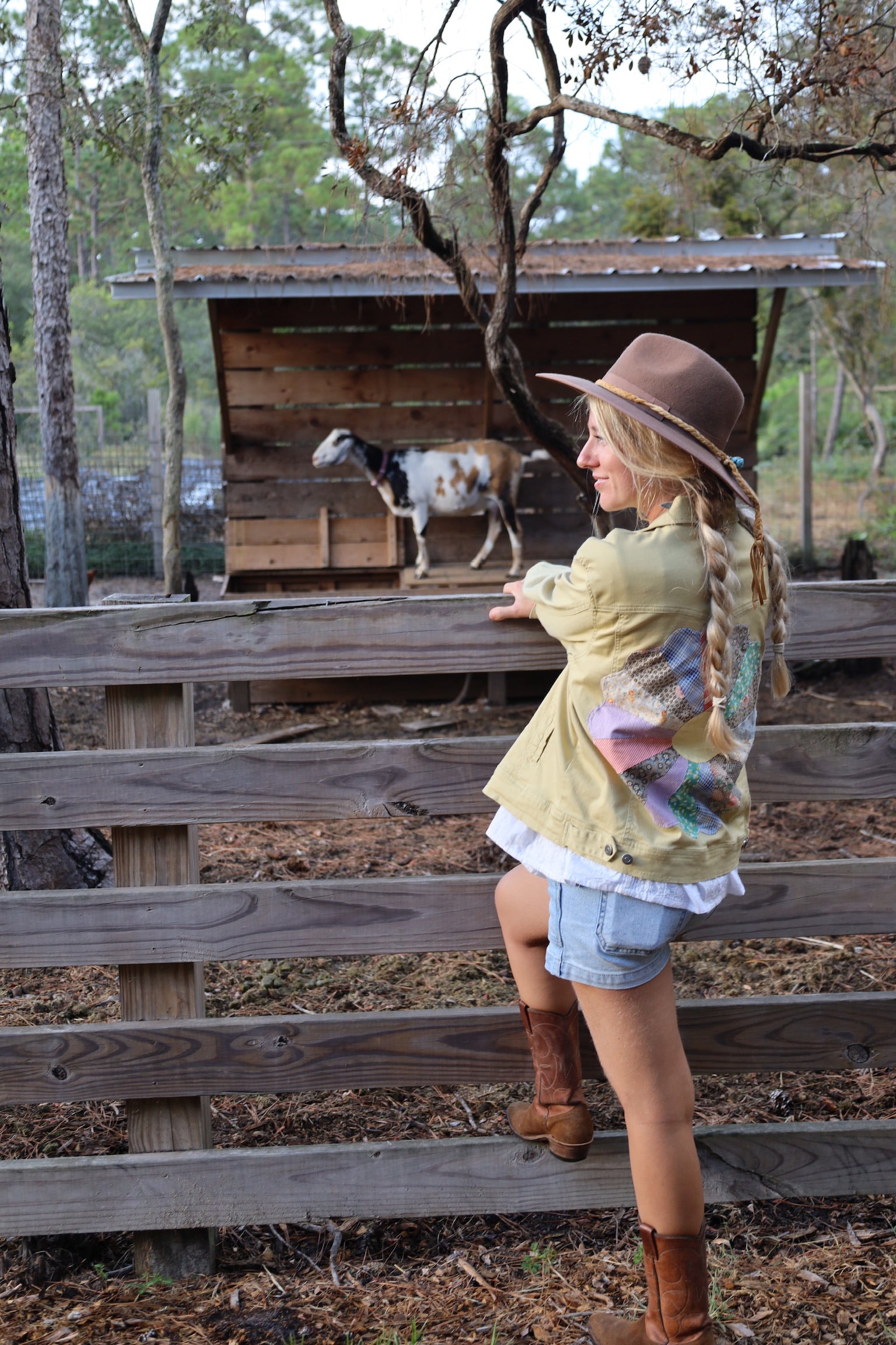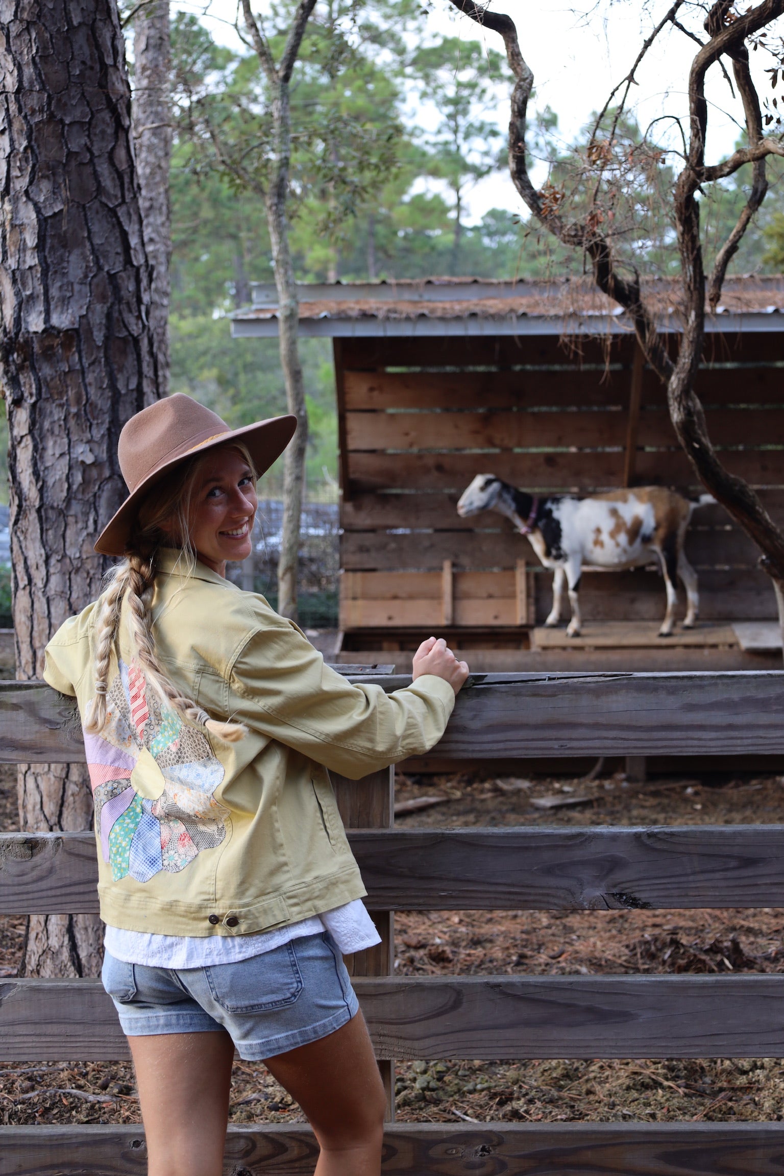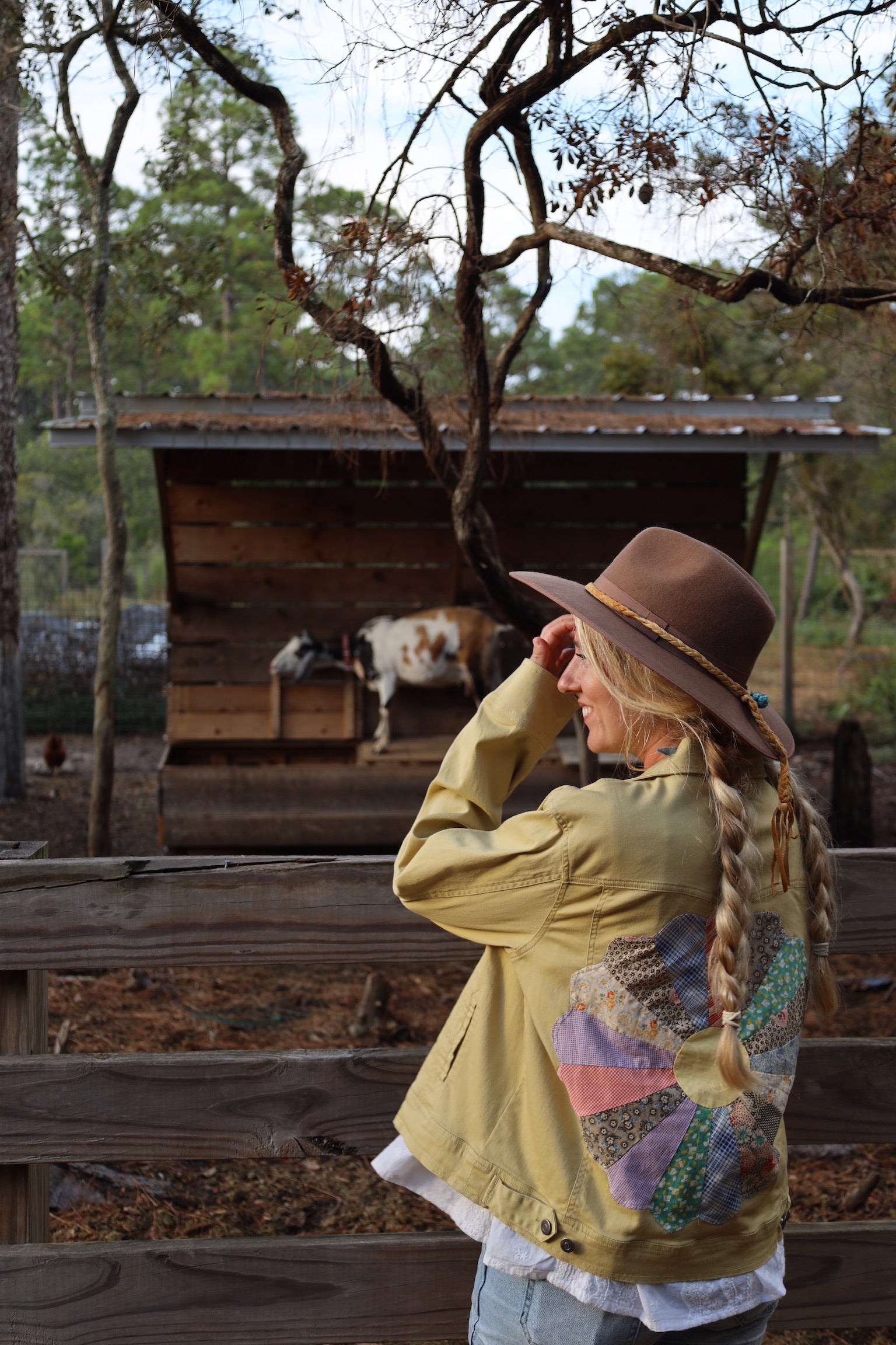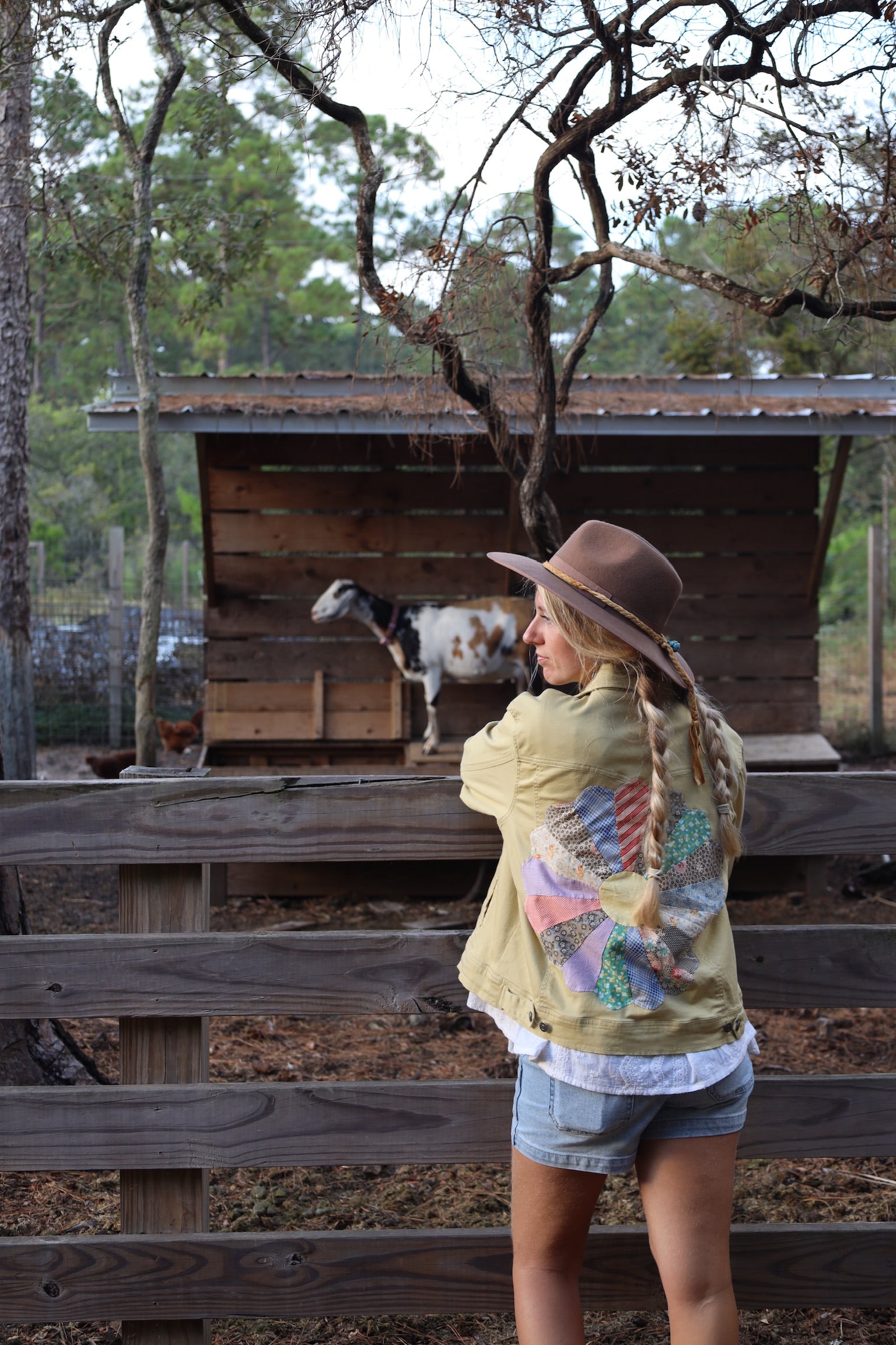 beautifully crafted from a denim jacket with a large antique quilt flower applique on the back